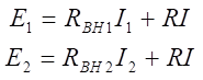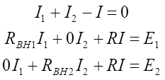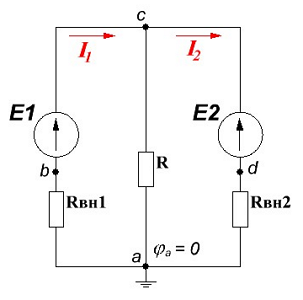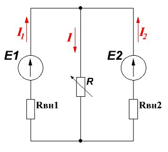 В качестве такой цепи рассмотрим двухконтурную цепь с двумя источниками положительного напряжения. В её состав входят: два источника ЭДС Е1 и Е2 со своими внутренними сопротивлениями RВН1 и RВН2, а также общая нагрузка цепи R.
