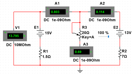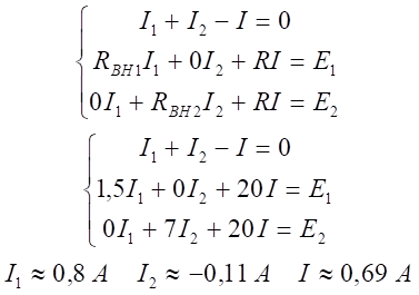 В качестве примера рассмотрим двухконтурную цепь с двумя источниками питания со следующими параметрами: E1 = 15 В, RВН1 = 1,5 Ом, R = 20 Ом, E2 = 13 В, RВН2 = 7 Ом.