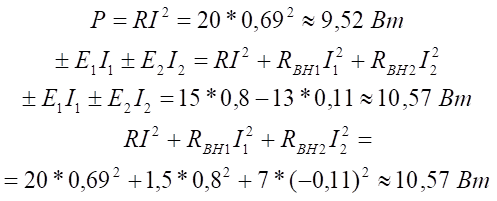 Условие баланса мощностей состоит в том, что алгебраическая сумма мощностей, развиваемая источниками энергии, равна сумме мощностей, потребляемой нагрузкой и затрачиваемой внутри источников энергии. То есть для нашей схемы должно выполняться равенство