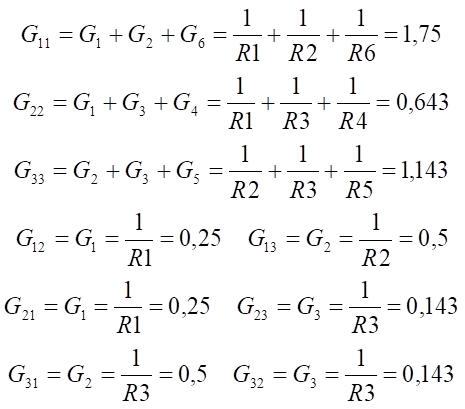 G12, G13, G21, G23 G31, G32 – сумма проводимостей ветвей, соединяющих соответствующие узлы;