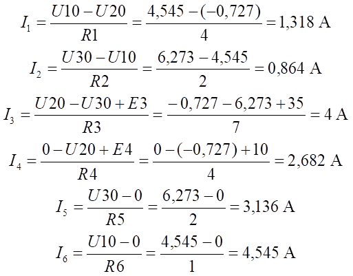 | Узловые напряжения | Токи ветвей схемы | ||||||||