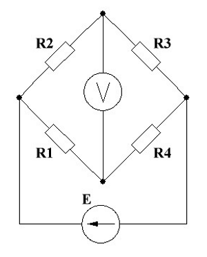 Использование моста сопротивлений для измерения электрических и неэлектрических величин связано с тем, что он уменьшает или полностью убирает погрешности от сопротивлений соединительных проводников. Также он обеспечивает напряжение, которое пропорционально измеряемому сопротивлению. Схема измерительного моста представлена ниже