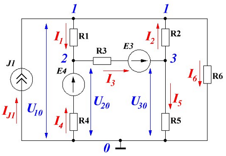 Для анализа цепи примем следующие исходные данные: E3 = 35 В, Е4 = 10 В, J1 = 5 А, R1 = 4 Ом, R2 = 2 Ом, R3 = 7 Ом, R4 = 4 Ом, R5 = 2 Ом, R6 = 1 Ом.