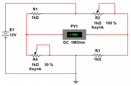 Схема в Multisim, моделирующая работу измерительного моста постоянного тока.